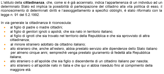 La cittadinanza (riconosciuta anche allo straniero, purchè in condizioni di reciprocità: art. 16 prel. c.c.) indica l'appartenenza di un cittadino ad un determinato Stato e la titolarità dei diritti e dei doveri che quest'ultimo riconosce. E' apolide chi non ha appartiene ad alcuno Stato. I modi di acquisto della cittadinanza sono stabiliti dalla L. 5.2.1992, n. 91. |