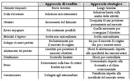 La tabella evidenzia la differenza esistente tra un approccio orientato alle vendite e uno fondato sulla gestione strategica del mercato internazio-nale. L'approccio di vendita può caratterizzare solo il comportamento di un'impresa che si trovi nella fase iniziale del processo di internazionaliz-zazione. Un'adesione prolungata a tale linea rappresenta una condanna certa per lo sviluppo ed il successo delle sue attività internazionali.