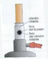 L'oggetto che sto per descrivere è un bruciatore per gas illuminante molto usato nei laboratori chimici e di oreficeria perché produce una fiamma ben controllabile con temperature fino a 1500 °C. Si tratta del dispositivo più usato per riscaldare soluzioni acquose. E' composto da un tubo di ottone collegato, mediante tubo apposito, alla rete del gas. Questo, giunto alla camera C, viene miscelato con l'aria dell'ambiente prelevata attraverso due fori di ampiezza regolabile grazie alla rotazione i un cilindro recante, a sua volta, due fori. L'aumento di quantità d'aria comporta una miscela più ricca di ossigeno e quindi una reazione di combustione più vivace alla quale corrisponde una temperatura più elevata. La fiamma è costituita da due zone, visibili a occhio nudo: una zone interna a temperatura più bassa e una zona esterna a temperatura più alta. Questa differenza di temperatura può essere messa facilmente in evidenza ponendo un filo di acciaio trasversalmente alla fiamma stessa. Dopo pochi istanti esso manifesterà una colorazione rossa nei tratti in cui il filo viene a contatto con la zona "calda", mentre manterrà una colorazione grigia nella zona più "fredda".
