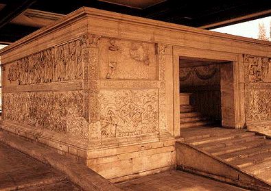Ara pacis Augustae (Altare della pace di Augusto), altare votato nel 13 a.C. e dedicato nel 9 a.C. dal senato romano alla celebrazione della pace instaurata da Augusto. Edificato a Roma nel Campo Marzio, andò in parte disperso e vari musei ne conservarono i frammenti: nel 1938 l'Ara pacis venne ricostituita quasi integralmente presso l'Augusteo, dopo lunghe e faticose ricerche in Italia e all'estero e una laboriosa camna di scavo a Roma. Costruita interamente in marmo lunense, si compone di un recinto, al di sopra di un podio, quasi quadrato, a due fronti (11,60 m) e due lati continui (10,60 m); su ogni fronte si apre una porta quadrata (lato 3,60 m). All'esterno la decorazione è divisa in due fasce, separate da un meandro: nella parte inferiore è una vasta composizione floreale, sopra sono scene urate. La decorazione superiore a ure presenta nelle due fronti due scene relative alle origini di Roma e due scene allegoriche. Ai lati è rappresentato invece il corteo solenne degli intervenuti alla consacrazione dell'altare, tra cui sono riconoscibili, oltre ad Augusto e ad Agrippa, altri membri della famiglia imperiale. Internamente il recinto è decorato, nella parte superiore a festoni, inferiormente a stecconata. Al centro è l'altare vero e proprio, su un podio di quattro gradini, con le sponde finemente decorate a motivi floreali e a ure, sia all'interno sia all'esterno. La perfezione tecnica della decorazione ne fa la più insigne testimonianza dell'arte classicizzante del secolo di Augusto.