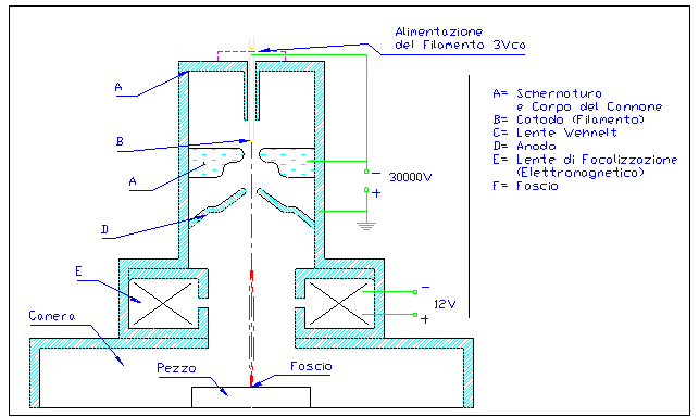 Il cannone è sistemato in una camera a vuoto ed è attrezzato per potersi spostare in senso verticale; il fascio rimane generalmente fermo e il pezzo da lavorare viene mosso alla velocità desiderata sotto il fascio elettronico (moto di alimentazione); le temperature ottenibili sono sufficienti a vaporizzare il Tungsteno (la cui temperatura di fusione è 3370°C) o qualsiasi altro materiale conosciuto.